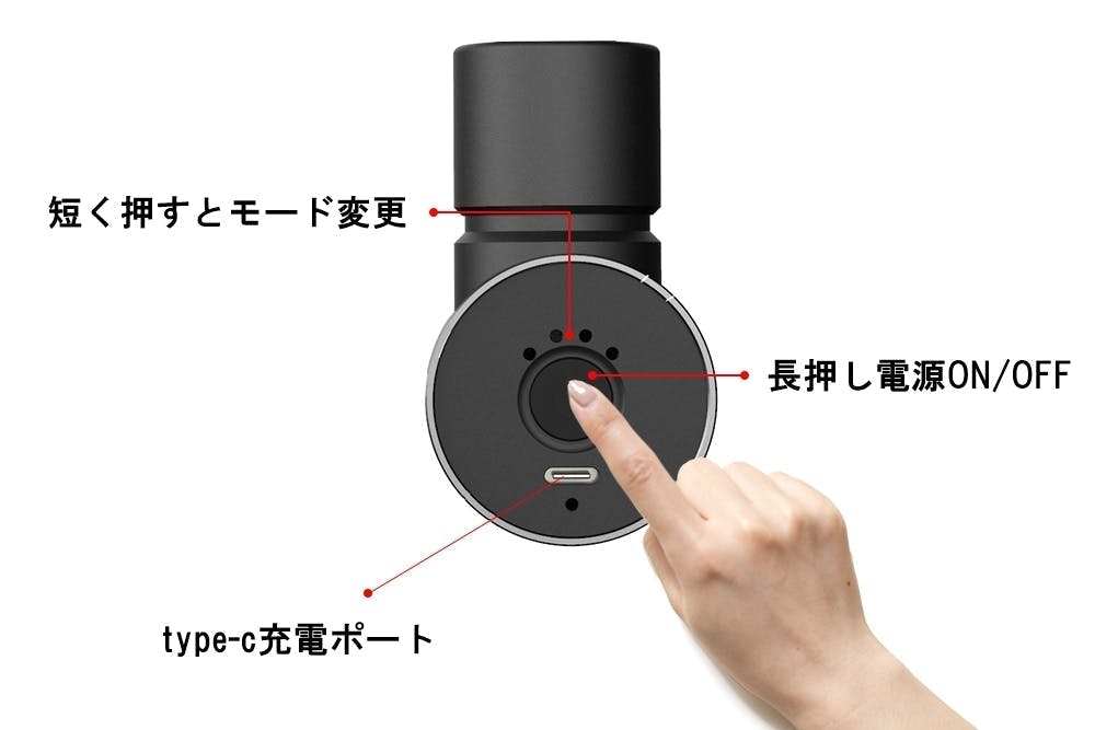 「CROSSGUN」は説明書を見なくても使える程のシンプルデザイン。電源ボタンを長押しでON/OFF。稼働中に電源ボタンを短く押すことによって4パターンに強さが変わり、ランプでお知らせしてくれます。