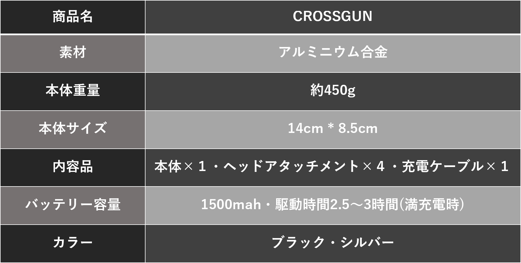 デザイン性を追求し、強力なパワーと持ち運びをしやすいように軽量化された「CROSSGUN」ジムでの筋トレ後やリモートワークやオフィスでのPC業務。そんな毎日に体のケアをサポートし大事な体をリセット!